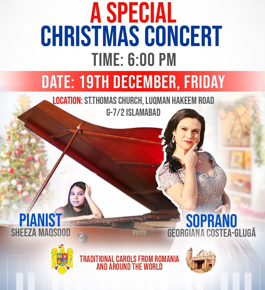ISLAMABAD, Dec 13 (Alliance News): The Embassy of Romania in Islamabad has announced a special Christmas carols concert to celebrate the festive season, featuring renowned Romanian soprano Georgiana Costea-Gluga and Pakistani pianist Sheeza Maqsood.
